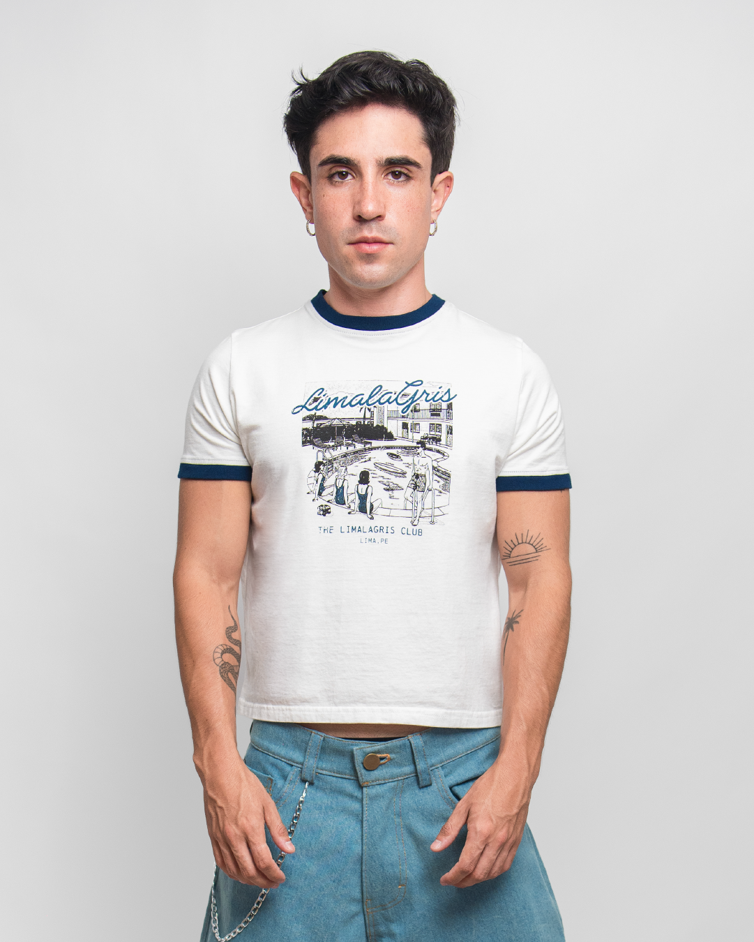 El Baby Tee está confeccionado en algodón jersey 20/1, una tela ligera pero estructurada que se adapta al cuerpo manteniendo firmeza y comodidad. Su diseño tipo ring tee incorpora cuello y mangas en rib acanalado contrastante, aportando ese detalle deportivo clásico que eleva la pieza sin exagerar.